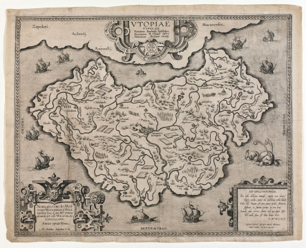 The Map of Utopia was made in 1595-1596 by Abraham Ortelius and illustrates the utopian island imagined by Thomas More in his famous literary work. The map was printed in twelve examples and the only one to have been preserved is that present today at the Plantin-Moretus Museum.