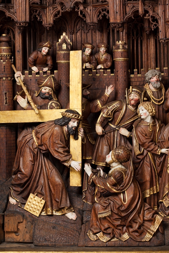 The masterpiece has been attributed to the Brussels sculptor Jan Borman the Younger and the painter Lambert Lombard (for the shutters). The upper part, the case, shows the Passion of Christ, whilst the lower part, the predella, tells the life of Saint Denis.