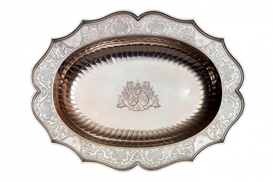 A set of three solid silver oval dishes. Each dish comprises four double accolades, joined together by small concave segments. The wings are covered with interlacing and foliage engraved on a matt base. The crests of the Wargny d’Audenhove and Merchier families are engraved in the centre of the largest dish. The large dish is 34cms wide and 45cms long. Each of the two smaller dishes measures 27cm by 35cm.